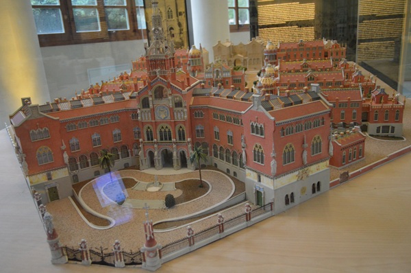 この模型が病院の構造になっています。正面の建物の後ろには中庭があります。サン・パウ病院は、145,000平方メートルという広大な敷地を誇る、カタルーニャ地方独自のモデルニスモ建築様式の病院です。この広さは、サグラダファミリアの約12.5倍にもなります。敷地内には48もの建築物が立ち並び、全体で一周1.6kmにもなる広大な施設です。
