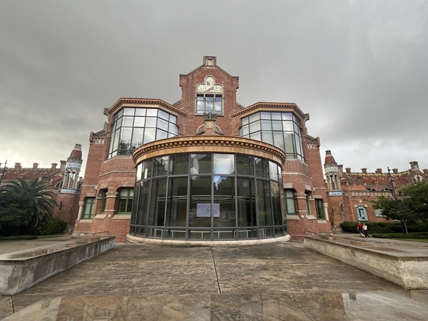 中庭に出ると、サン・パウ病院の全体像を一望できます。左右対称に並ぶ建物群は、それぞれにデザインのこだわりが詰まっています。