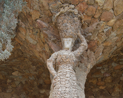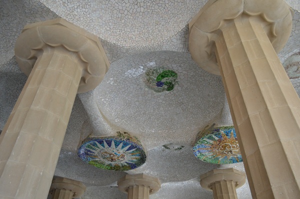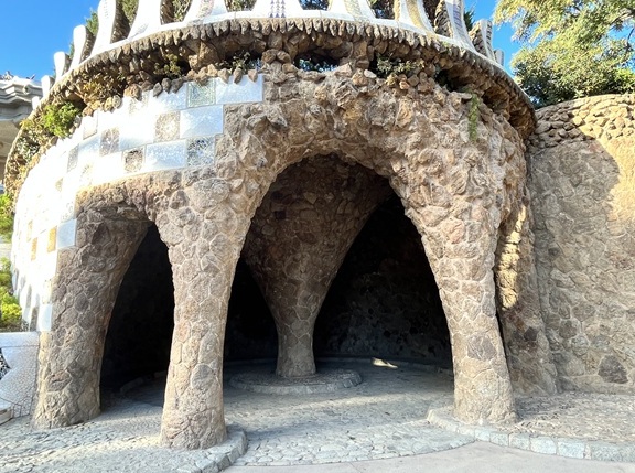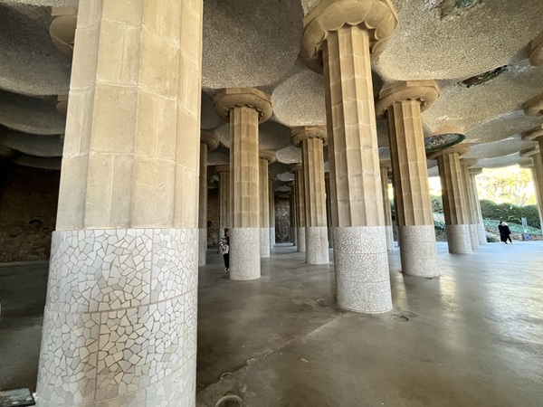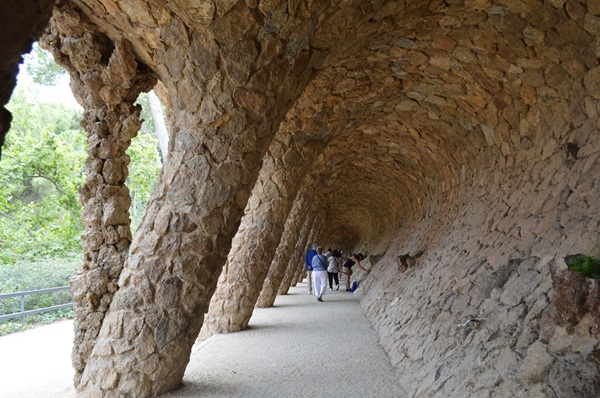 洗濯女の回廊。グエル公園の公衆エリア(市場、広場)から別荘まで簡単に行けるように、ガウディは長い通路を造りました(建設資材は近くにあった石なので、周りの自然とは、通路の色や形がミスマッチしません)。中央広場と洗濯女の間にある鉄の門は、蝶をイメージしています。通路は、波・サーフィングする時のチューブをイメージしています。柱1本が、カリアティードをイメージし、写真スポットになっていますよ。壁にある「丸い穴」は、サボテンの植木鉢になる予定でした。