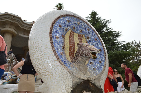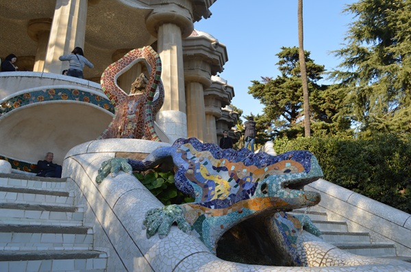 グエル公園のシンボルともいえるのが、カラフルなタイルで装飾されたドラゴンの噴水像がある大階段です。この階段には、公園内で一番人気とも言われるカラフルなトカゲ(またはカメレオン)がいます。