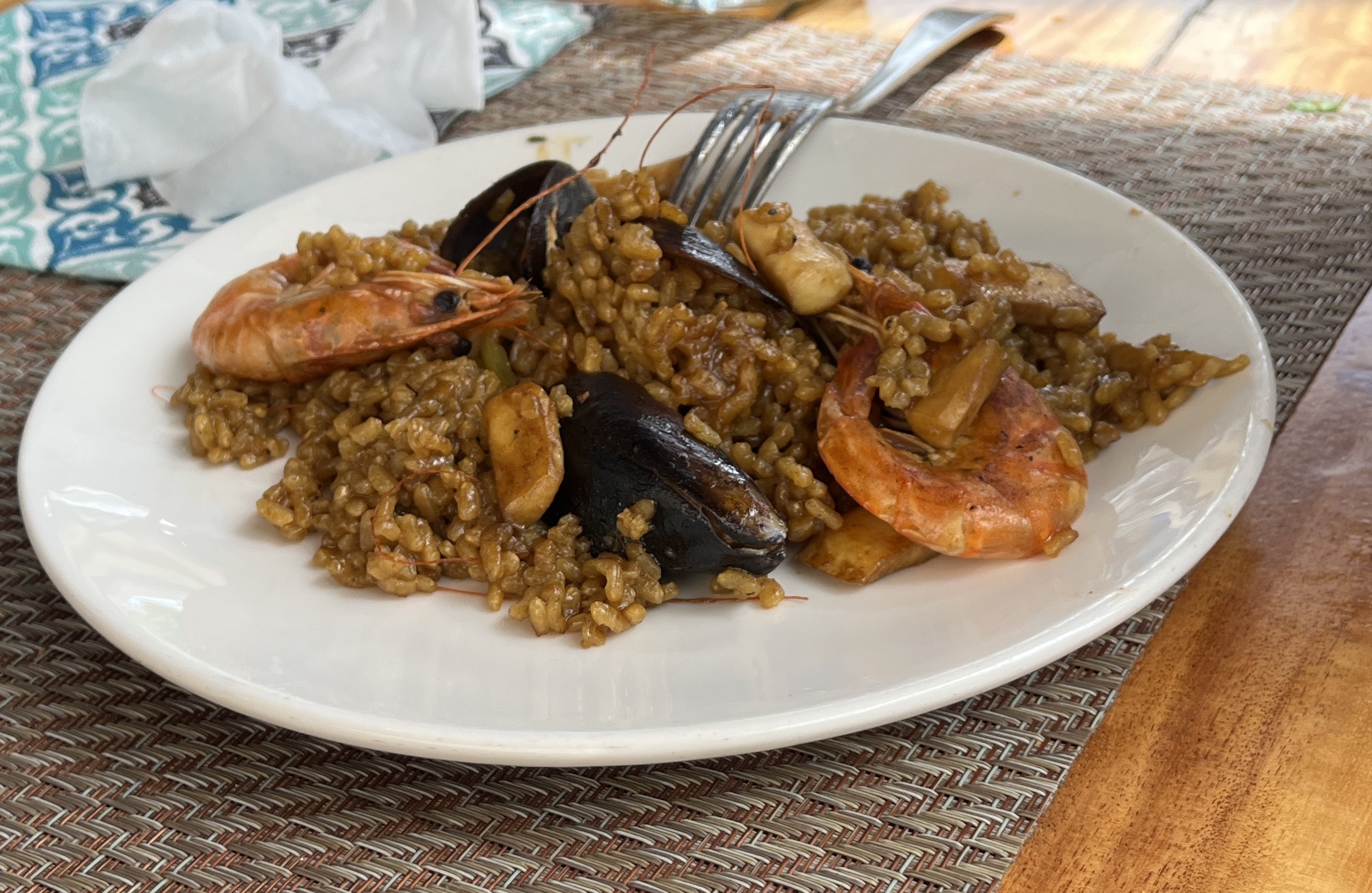 1日目のお昼はパエリア。バスを降りて海沿いの道を少し歩きます。