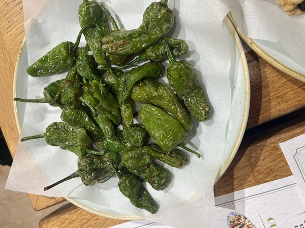 ししとうによく似たパドロンという甘味の強い青唐辛子をオリーブオイルで素揚げにし、粗塩を振ったシンプルな料理。スペインでは定番の料理だそうです。
