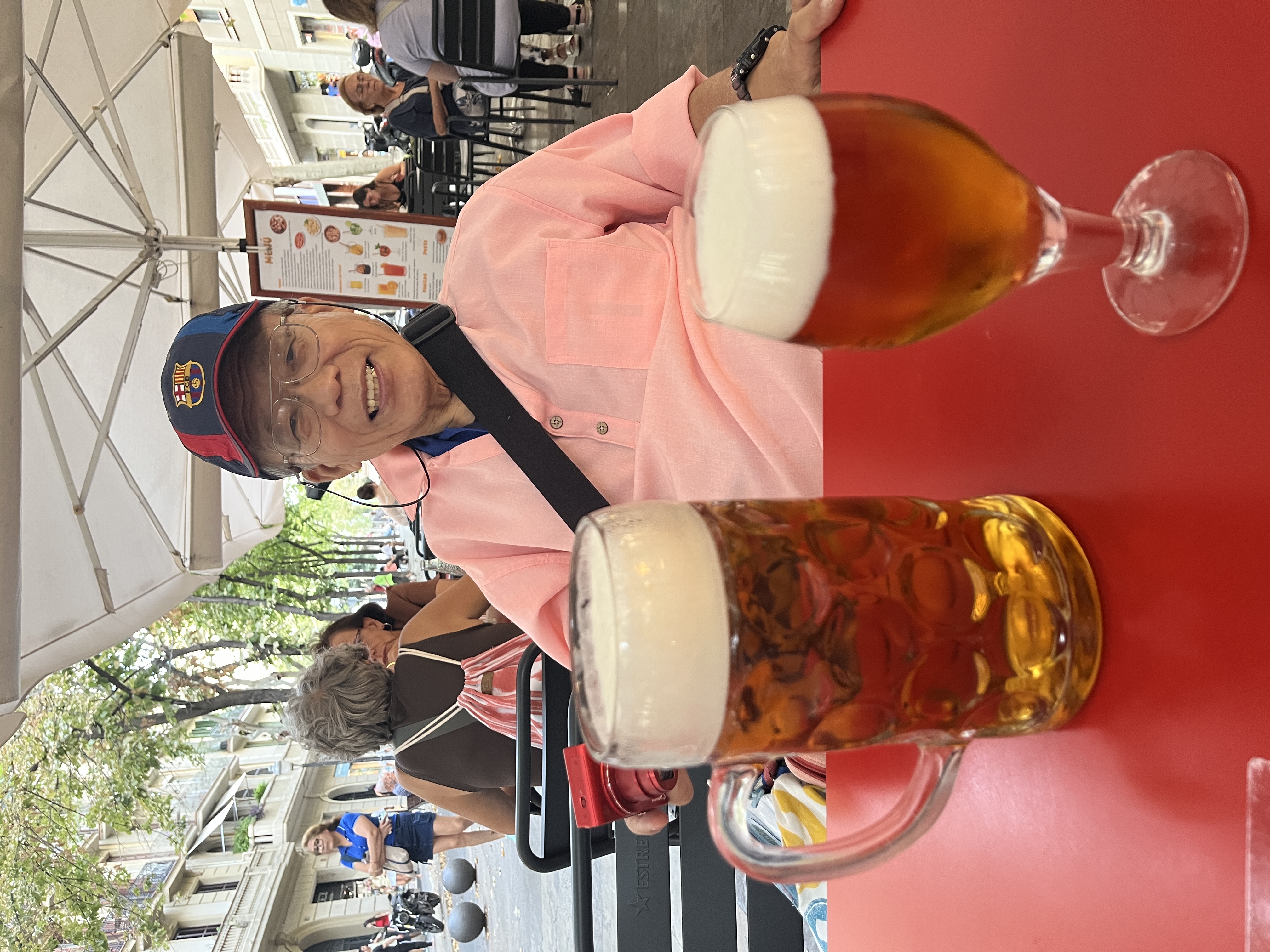 屋外テーブル席でサグラダファミリアを眺めながらまったりとビールを飲みました。なんと主人は1リットルのビールです。