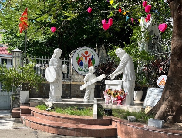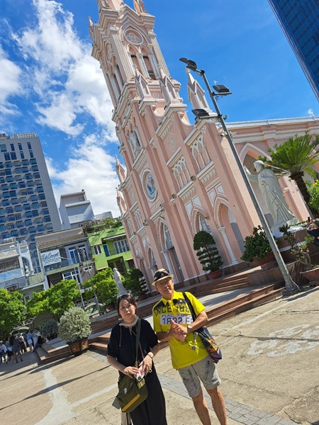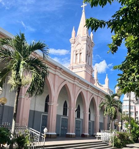 ピンクに塗られた可愛い教会です。また、尖った屋根の頂上に風見鶏があることから、ダナン大聖堂は別名、鶏教会とも呼ばれ、親しまれているそうです。背後に近代的なオフィスビルがあるのにはビックリです。