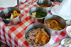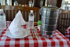 パパール駅で車内に戻ってくると食事が用意してあります。可愛いチェックのテーブルクロスの上にお弁当箱4段が置いてありました。昼食はティフィンスタイルのお弁当。イギリス領時代の文化であるコロニアル風な積み上げ式のお弁当箱「Tiffin」がとてもかわいらしい。スタッフのコスチュームも当時の服装を再現しているそうです。