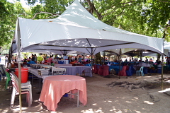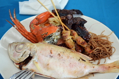 ランチの時間になると長蛇の列。内容はサテ、焼きそば、カニ、エビ名前の知らない魚などです。豪快におじさんが魚やカニをお皿の上におかまえなしに載せていきます。