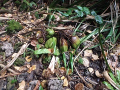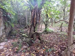 たくさんのヤシの実が落ちており、そこから芽が出ています。道なき道を更に進んでいきます。小雨が降っていたため傘を借りていました。いい杖になりました。