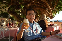樹齢数250年のハウツリーの下でディナーです。ハウツリーとはアオイ科のオオハマボウで、英名はBeach Hibiscus その名の通りハイビス カスの仲間。ラナイとはハワイ語で大型バルコニーのこと。頭上に大きなハウツリーがあるんですが写真撮るの忘れてました。 |