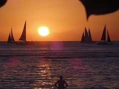 だんだん日が落ちてきて水平線に太陽が消えていくのを眺めていました。凄く美しいサンセットです。雨じゃなくてよかった。 現地の方たちは日が落ちても海に入っているんですね。真っ暗なところで泳いでいました。 |
