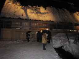 5時過ぎになり辺りは少し暗くなり世界遺産(白川郷)のライトアップが綺麗です。ライトアップ初日でもあり沢山の人出があります。