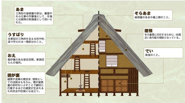 誰もが気になる合掌家屋の中身。私たちが住んでいる家とは違うはず! 三角屋根のてっぺんにはなにがあるのでしょうか? 合掌造りの家屋は一般の家屋よりも断然大きく、3〜5階建ての巨大な家屋に、大家族制のもと、30〜40人が住んでいました。