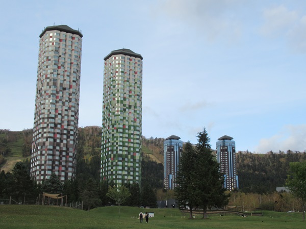 ファームエリアから見えるのが星野リゾート、トマムザ・タワー(宿泊場所) です。この建物はリゾートの中央に位置する36階のタワーホテルです。この建物を見て宿泊を決めました。