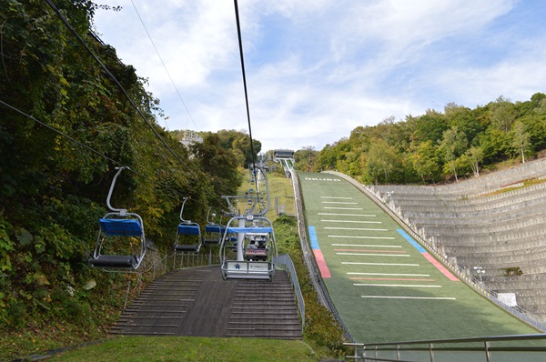 展望台にはスキージャンプ競技選手も利用している二人乗りリフトで移動します。急勾配のアプローチやカンテと呼ばれる踏切台をすぐそばに感じながら展望台を目指す約5分間。