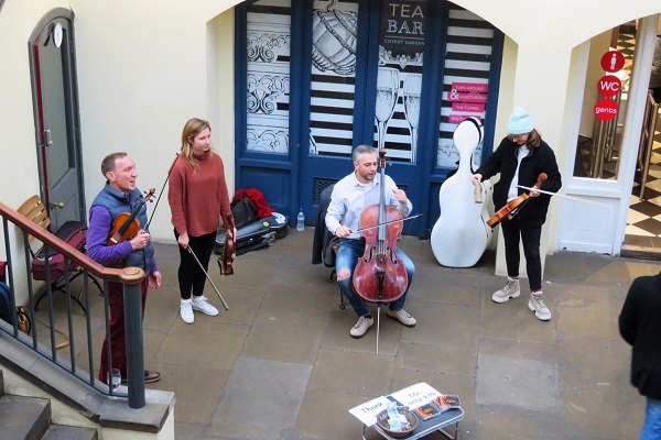 ゴヴェントガーデンは、ロンドンの中心に位置しているマーケットで、アクセスも良くたくさんの人で賑わっています。 石造り建物には約40店舗が並びお洒落なお店が並んでおり、小さな屋台はとっても可愛い飾り付けでお土産を売っています。地下にはテーブルとイスが置いてあるので休憩しながらその横でヴァイオリン演奏を聴くことが出来ます。パフォーマンスをしている人もいますね。