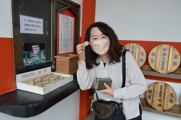 釜蓋は拝殿横に置かれているものを無料で利用できます。では頭に釜蓋を乗せ、鳥居から拝殿までの約10mを落とさず歩くことができれば、願いが叶うと言われています。