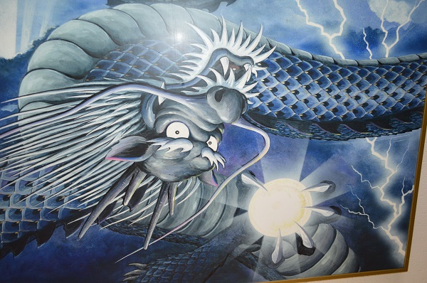殿の天井に描かれている龍神の絵。龍神が持っている玉は不思議と光って見え。この絵を携帯で撮影して待ち受け画面にすると開運が良いとされているようです。