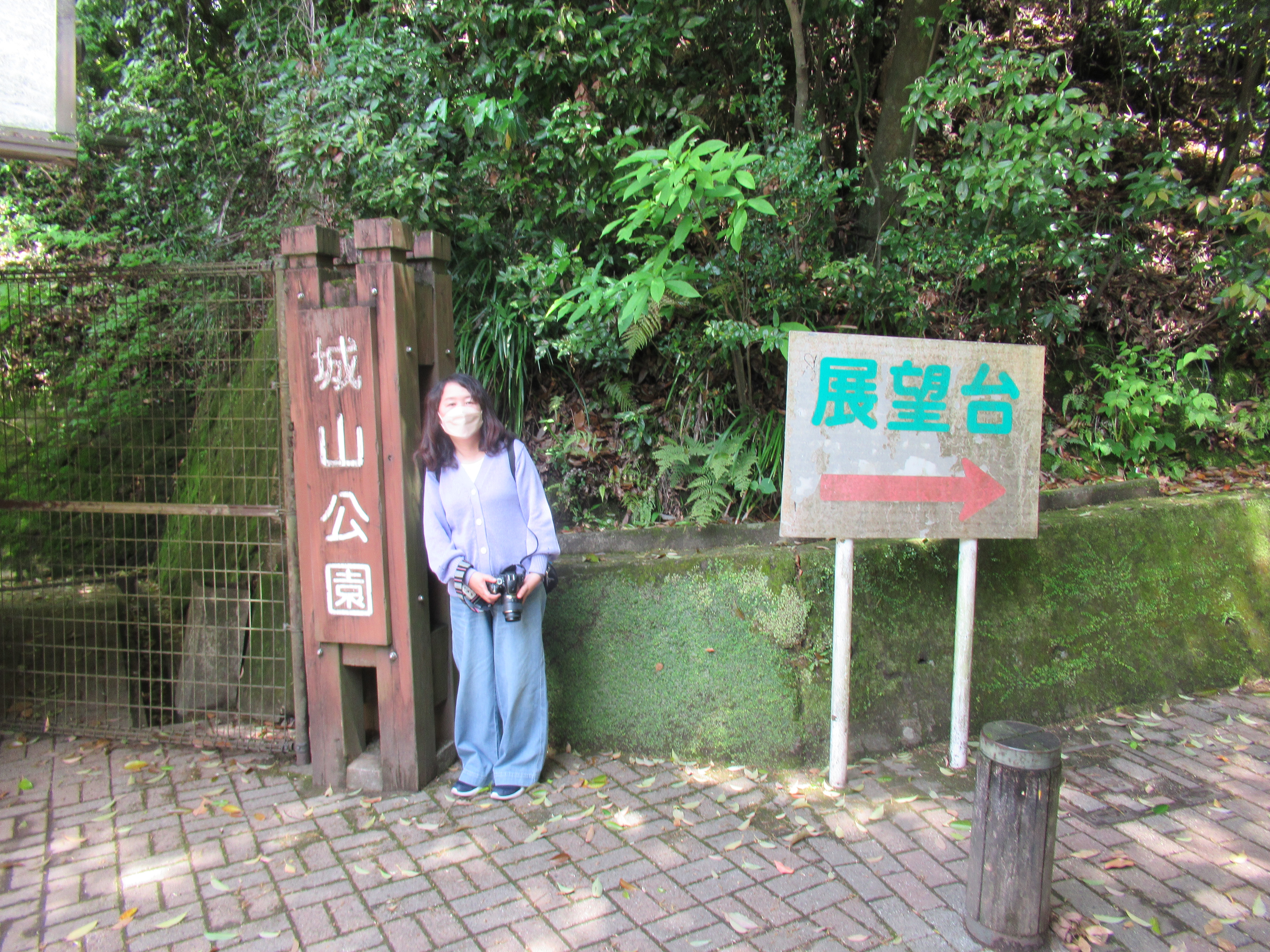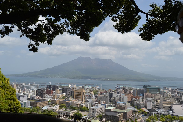 民芸店さんからバスで25分城山公園に到着25分の観光です。城山公園は市街地の中心部に位置する標高107mの小高い山で、展望台からは桜島をはじめ錦江湾や鹿児島市街地を一望できます。