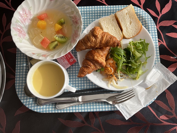 メインメニュー(スクランブルエッグ・ウインナ・など)があり、サラダやパンなどはバイキングになっています。洋食スタイルの朝食です。