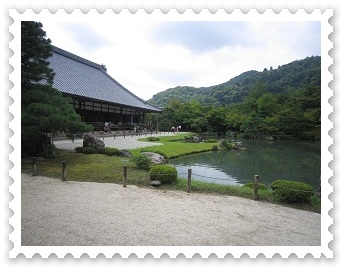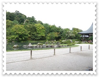 曹源池、 夢窓国師作。嵐山、亀山などを巧みに取り入れた我が国借景式 庭園として、わが国では始めて特別名勝に指定されています。広くていつ見ても心が穏やかになる感じがします。 |