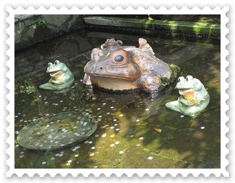 このカエルちゃんの前にはお皿があって、そこめがけてお金を投げ、見事入ると、幸せになれるらしいです。本当でしょうか? |