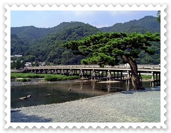 ここが渡月橋です。渡月橋は嵐山の大堰川(保津川)と桂川を分けてまたがる橋です。桜の名所ともなっています。 |