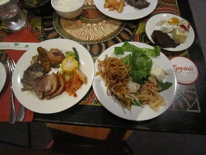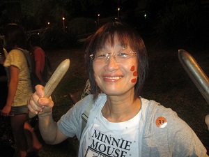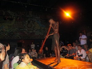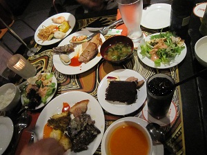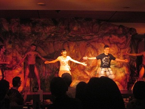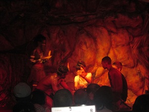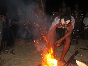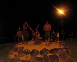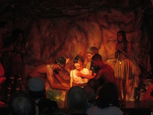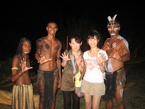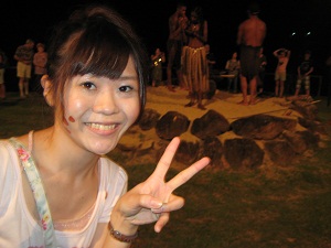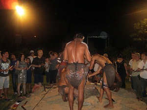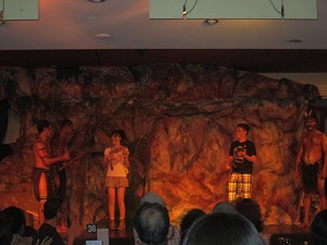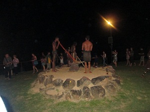 ダンスショーバイキング開始から30分位たったでしょうか。アボリジニのダンスが舞台上でくりひろげられました。一緒に火越しをする人を募ることに、わが娘挙手をしみごと選ばれて舞台に上がることに、火起こしを試みますが点火できず、アボリジニの方がやっても点火できませんでした。その後一緒にアボリジニダンスを楽しく踊っていました。(積極的な性格うらやましい)