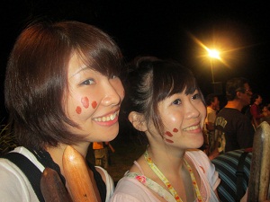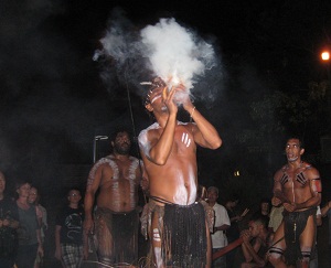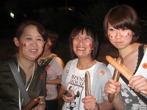火と水の歓迎儀式ショー建物の外に出るとスタッフの方からビブラという木製のスティックを渡されます。スティックを打ち鳴らしながら、みんなで足を踏み鳴らして「ビリー(火)」「ビリーワーイー(火熾し棒をこすれ)」や「ビリージャネィもっと火を熾せ)」という言葉を唱えて火熾しをみんなで応援し、顔にはアボリジナルフェイスペイントをしてもらいます。 小さな火種が草に広がり、大きな炎になります。その炎を少し離れた湖畔の向こう側になげると、その瞬間炎がたちまち燃え上がりました。結構迫力ありました。この儀式が終わると、まちにまったディナーです。