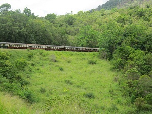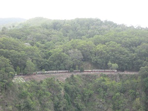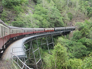 キュランダ列車に乗ってキュランダ村へ列車の写真どこかで見たことがありませんか?テレビ『世界の車窓から』のオープニングを10年間も務めたキュランダ観光列車です。日本人ガイドさんが列車の中で詳しく説明をしてくれます。長い時間ですが飽きることもなく過ごせます。シャッターチャンスの所は、列車がのんびりと走るのも観光列車のよいところです。進行方向右側に観光スポットがより多くあるので、座席がみな右にあるのでしょうか?