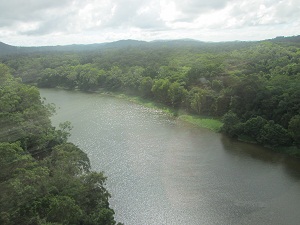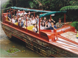アーミーダックに乗車キュランダから車で5分ほどの所にあるテーマパーク、レインふぉれステーション・ネイチャーパークで。アミ―ダックに乗ることが出来ます。アーミーダックとは、第二次世界大戦で使用されていた6輪駆動の水陸両用車です。時間は約45分深い熱帯雨林の森の中へ。まずは陸上をドライブ急な斜面を下っていきます。途中ガイドから、陸路を行くか?危険な水路にチャレンジするか?という選択肢を質問されますが皆さん一致で水路を行く事に決定 。もちろんそれが楽しみだったからです。水の中を音をたてながらはいていきます。スリル満点。森林雨林の植物の説明をガイドさんがしてくれます。