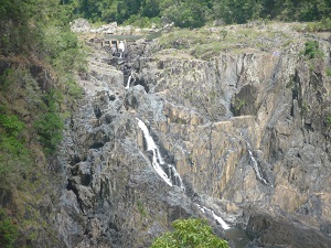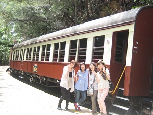 バロンフォールズ駅途中下車皆で写真撮影キュランダへ向かう途中バロンフォールズ駅でバロン滝を見るために1 0分間一時停止してくれます。皆それぞれ滝を見たり、写真を撮ったりし ています。そうこうしていると10分後一度めの汽笛で「集まれ」の合図 が鳴り、それぞれに散っていた乗客が列車へ集まります。二度目の汽笛で 出発進行となっています。皆さんくれぐれも乗り遅れの内容にと注意があ りました。 あっという間にキュランダ駅に到着しました。楽しい列車の旅はここ までです。植物がいっぱいの小さな可愛いキュランダ駅です。キュランダ観光列車乗ってよか ったと思えるものでした。ケアンズに行く機会があったら是非乗ってみて ください。ツアーによっては日本語のガイドさんがいない場合があるよう です。その点も確認してください。