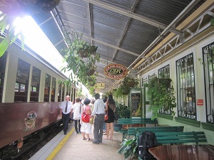 ![]() ケアンズ駅の中ケアンズの駅の中です。おしゃれなテーブル・いすが設置されています。キュランダへ出発するばかりの列車が待機中です。