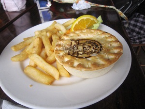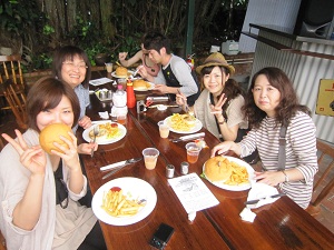 キュランダ村にて昼食キュランダ駅から数分歩くとキュランダ村に到着です。ランチは広いスペースの所でした。チキンパイとハンバーガを頼みました。チキンパイはチョット美味しくなく半分以上のこしていました。ハンバーガはとても大きく、そのまわりにはポテトが大量にのっています。美味しかったです。