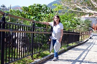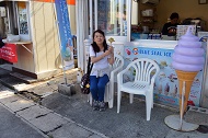 川平湾周辺お友達がいない、いないと探したところ駐車場前のお土産屋さんにいました。なんとマンタの形をしたさつま揚げに興味津々。買って食べました。 |
