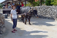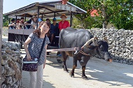 石垣島は高いビルもあり思ったよりも都会でしたが、ここ竹富島は集落の道には白砂がひかれ、赤瓦の屋根、屋敷にめぐらされた石垣があります。屋根の上にはシーサー、観光客を乗せた水牛車、沖縄に来たんだと実感できました。次回はゆっくりと島を巡ってみたいです。