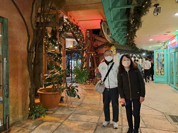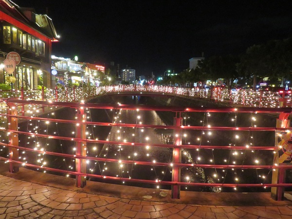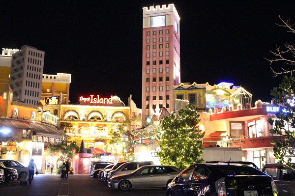 JUMBO STEAK HANASで夕食をすましてから夜のアメリカンビレッジを散策。ビックリするぐらいにヤシの木や、建物がカラフルにライトアップされています。