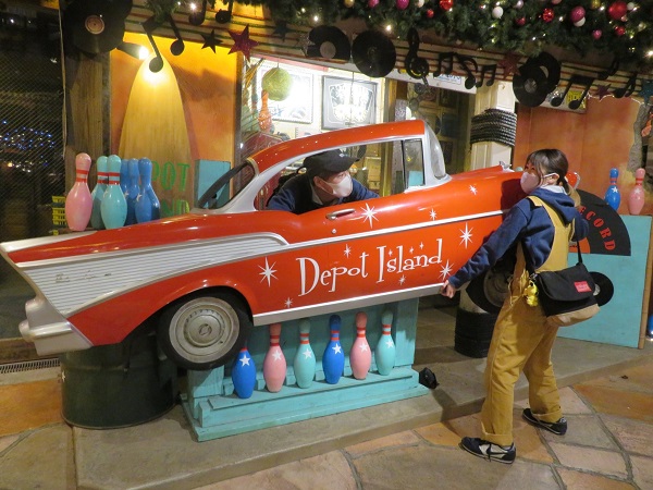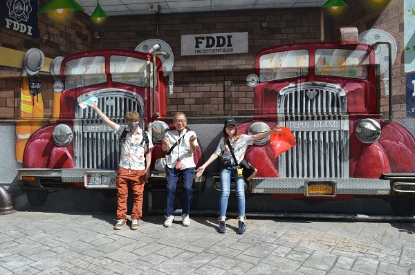 フォトスポットが点在しているのがデポアイランドの特徴なんだそうです。レトロな2代の消防車、アメ車のモニュメント(窓から顔を出して写真を撮ったりするんだそうです。)