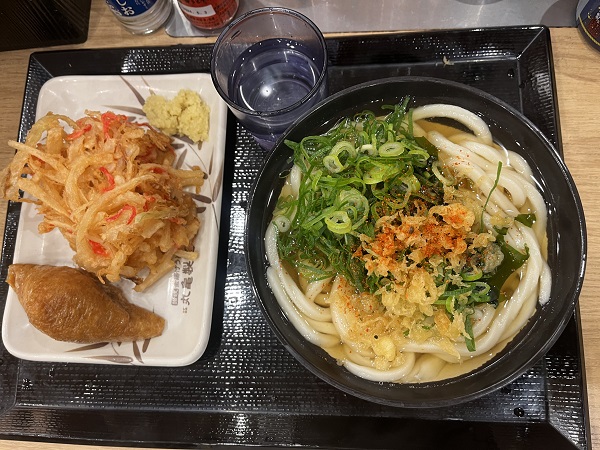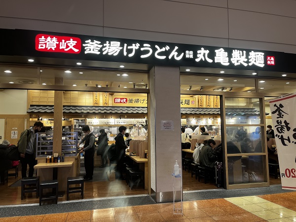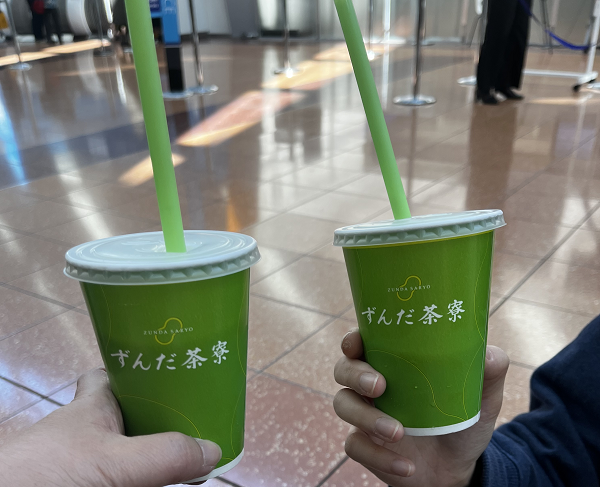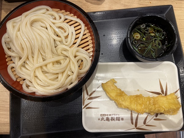 まずは、ずんだシェークと主人はビールで一息つきます。お昼は丸亀製麺でうどんを食べることに、通常のお店とは異なりメニューがないものがありますが定番の味です。
