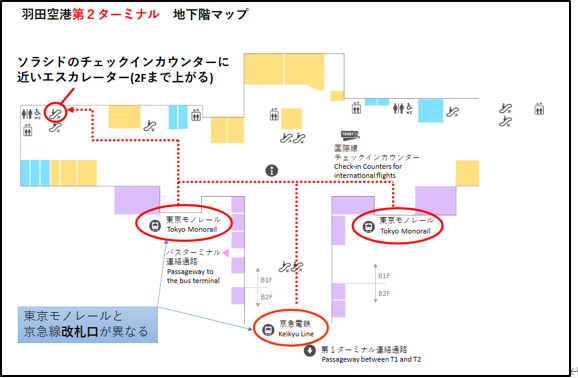 浜松町から11時のモノレールに乗り羽田空港第2ターミナルで下車。2階にあるソラシドエアチェックインカウンターに行きます。