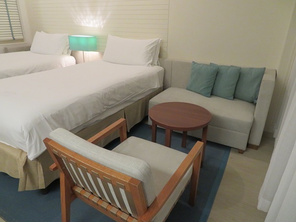 部屋は7階のビーチビューで朝起きて窓を開けてみたら遠くには万座毛を見ることができとっても良い眺めです。室内の白をベースに淡いグリーンの差し色もこの海にピッタリ。室内の紅茶はTWGで、コーヒーはネスプレッソがありましたが、出来たらミルクも同じ数あったら嬉しかったですね。