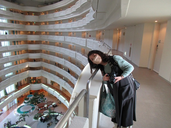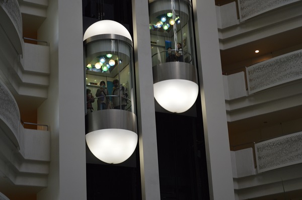 ホテルの中を散策してみましょう。エレベーターこれもまた変わった形(カプセルみたい)で表から中が丸見え。