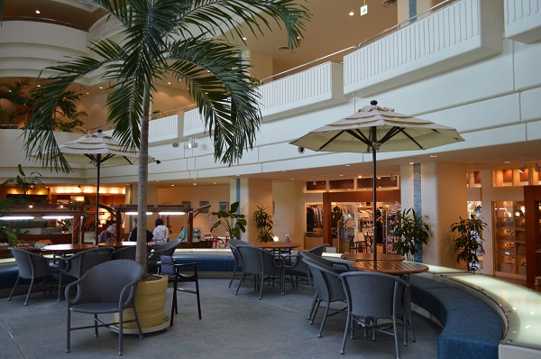 ロビーは吹き抜けで解放感があり南国リゾート感たっぷり。階段を降りた中央にはカフェ、外国に来ているみたいです。