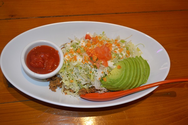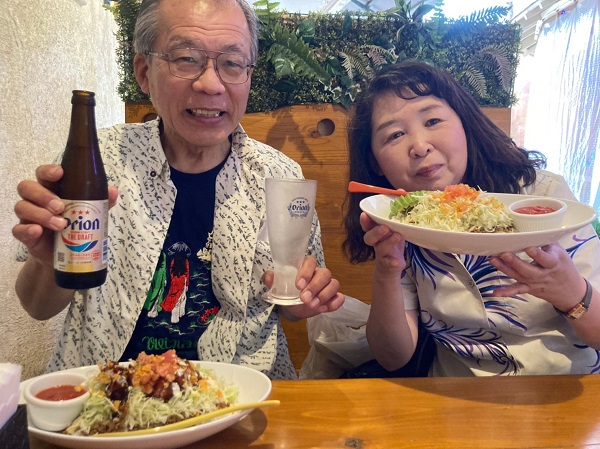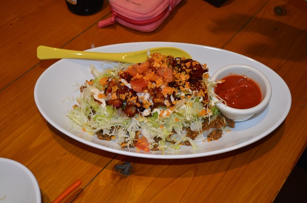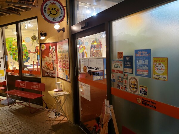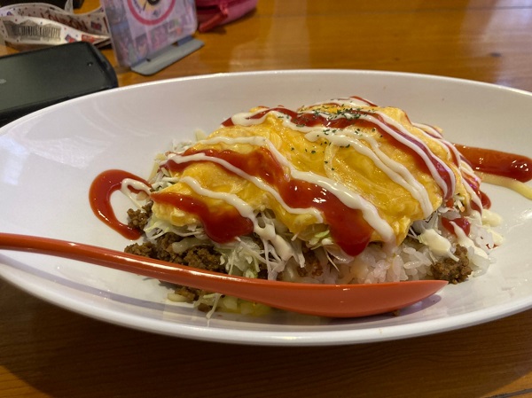 アメリカンビレッジの中にあるタコライスの専門店。チョット変わったキャラクター(キジムナーという妖怪)が入り口で待ってます。 タコライスは沖縄で生まれたソウルフードとも呼ばれる人気メニュー。 ライスの上にお肉お野菜やチーズをのせた料理。アボガトタコライス、照り焼きチキンタコライス。4種のチーズオムタコ などを注文。テラス席で頂きます。