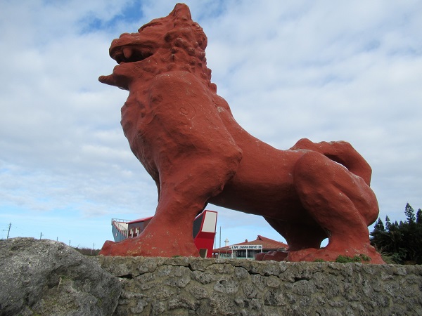 通常シーサーは魔物が来る方向に向けて置かれるのが一般的ですが、残波大獅子は中国大陸の方向を見るように設置されています。高さ8m75cm,長さ7.8mあるそうです。