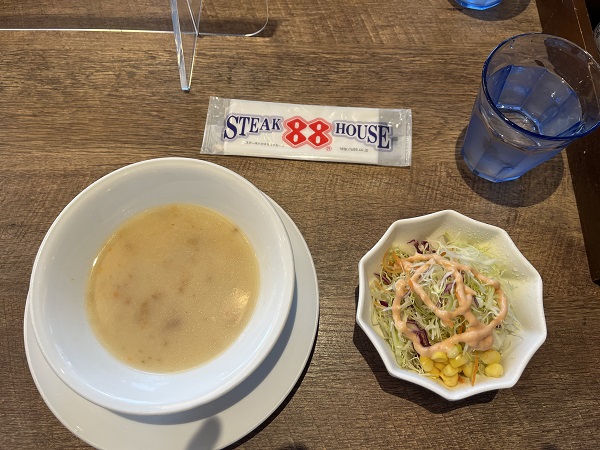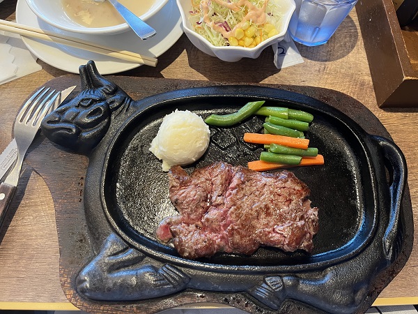 ステーキ150gのランチメニューを注文、ライス、スープ、サラダがついてきます。
