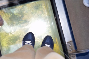 最後に乗ったのがスカイウェイ。ジャミソン渓谷の上空270メートルを滑るように往復するゴンドラは、底が透明ガラスになっています。 透明ガラスの上に立ってみました。下がよく見えて怖かったです。