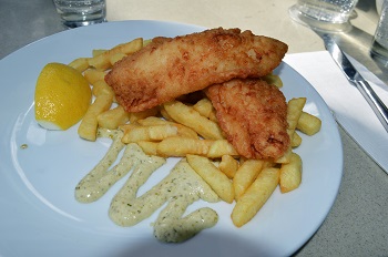 フィッシュ&チップスを頂きましたが、油っこくなく、サクサクとしていて美味しかったです。 ポテトフライがサイドメニューで添えてありますが、食べきれないぐらい沢山あります。 バラマンティというお魚だそうです。