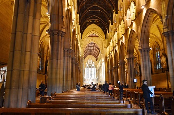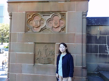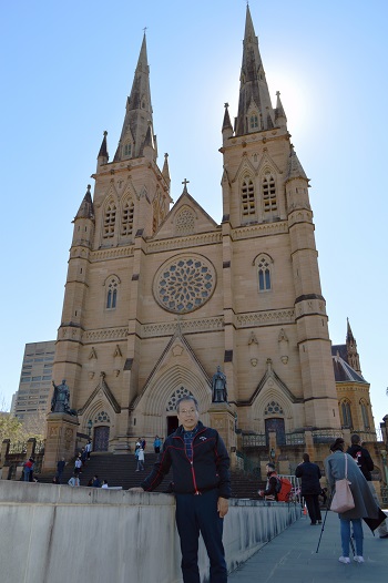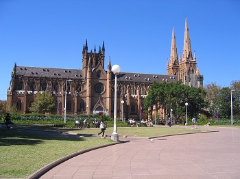シドニーを代表する荘厳なネオ・ゴシック建築のローマカトリック教会。塔の高さは74メートル、奥行きは最大107メートルあります。赤茶色の石造り、シンメトリーがとてもきれいです。 ここが正面。夕暮れ時に来るとさらに綺麗なそうです。