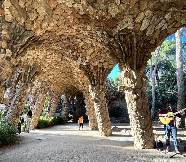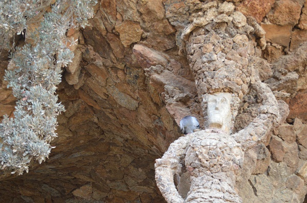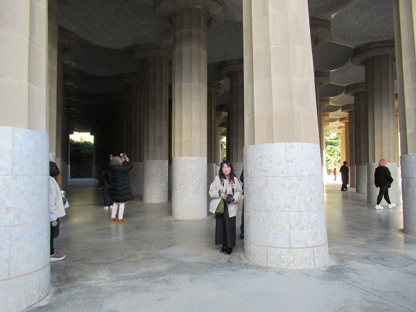 洗濯女の回廊。グエル公園の公衆エリア(市場、広場)から別荘まで簡単に行けるように、ガウディは長い通路を造りました(建設資材は近くにあった石なので、周りの自然とは、通路の色や形がミスマッチしません)。中央広場と洗濯女の間にある鉄の門は、蝶をイメージしています。通路は、波・サーフィングする時のチューブをイメージしています。柱1本が、カリアティードをイメージし、写真スポットになっていますよ。壁にある「丸い穴」は、サボテンの植木鉢になる予定でした。