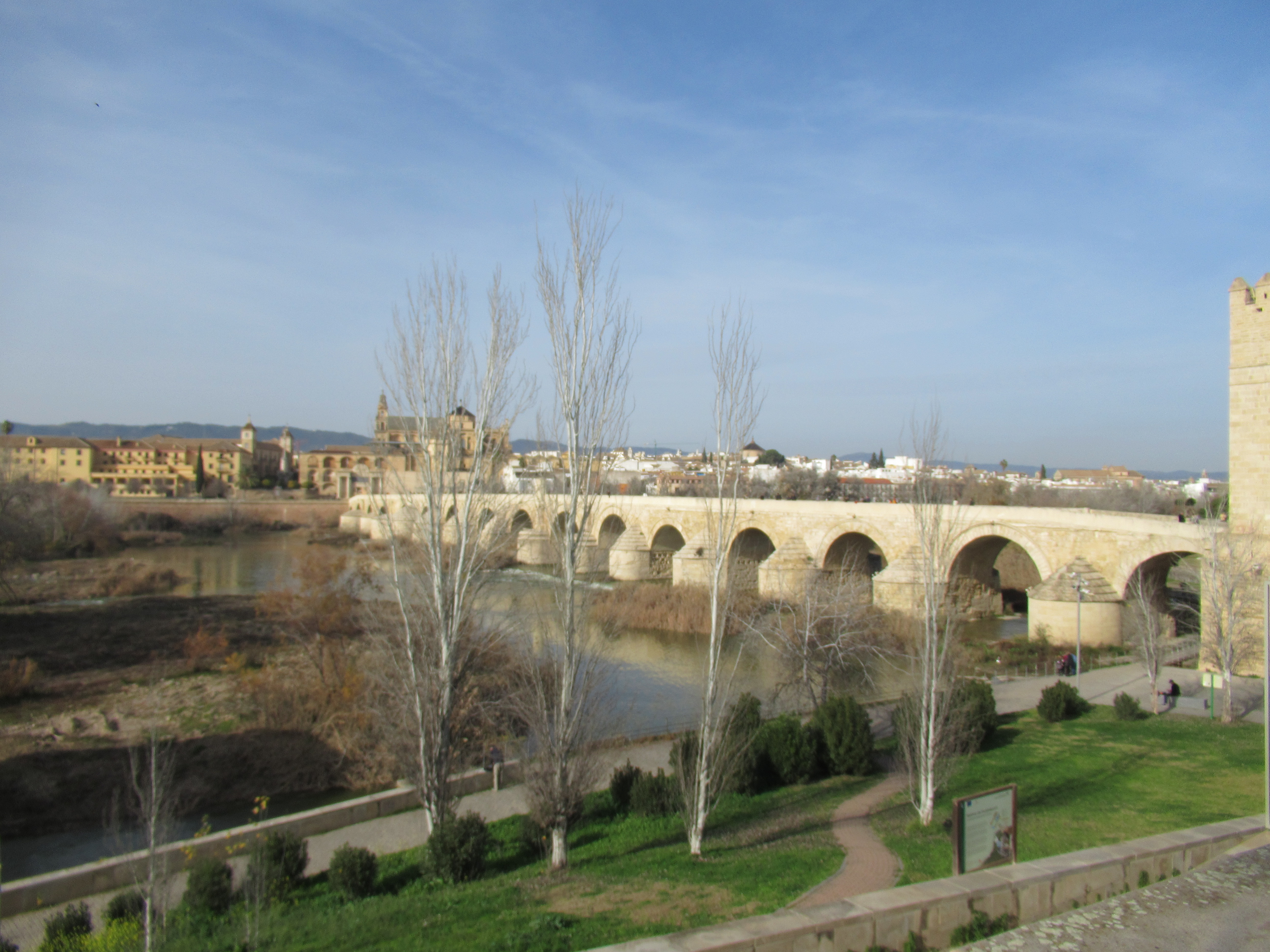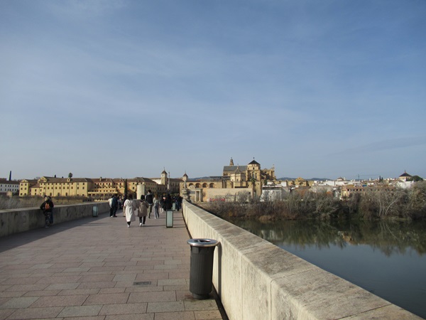 ラ・マンチャ地方からバスで約4時間コルドバに到着。バスを降りてカラオラの塔を見てローマ橋を渡っていきます。
