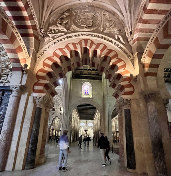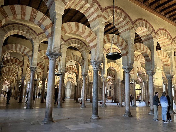 これは「円柱の森、イスラム時代の礼拝の空間で、かつては2万5000人の信者を収納したといいます。白と赤を組み合わせた馬蹄形のアーチ支える円柱が約850本並び立ちます。